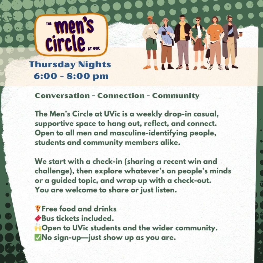The Men’s Circle at UVic aims to challenge gender-based violence and dominant constructions of masculinity. These gatherings are open to all men and masculine identified people (not just students!) so come and bring a friend or two!