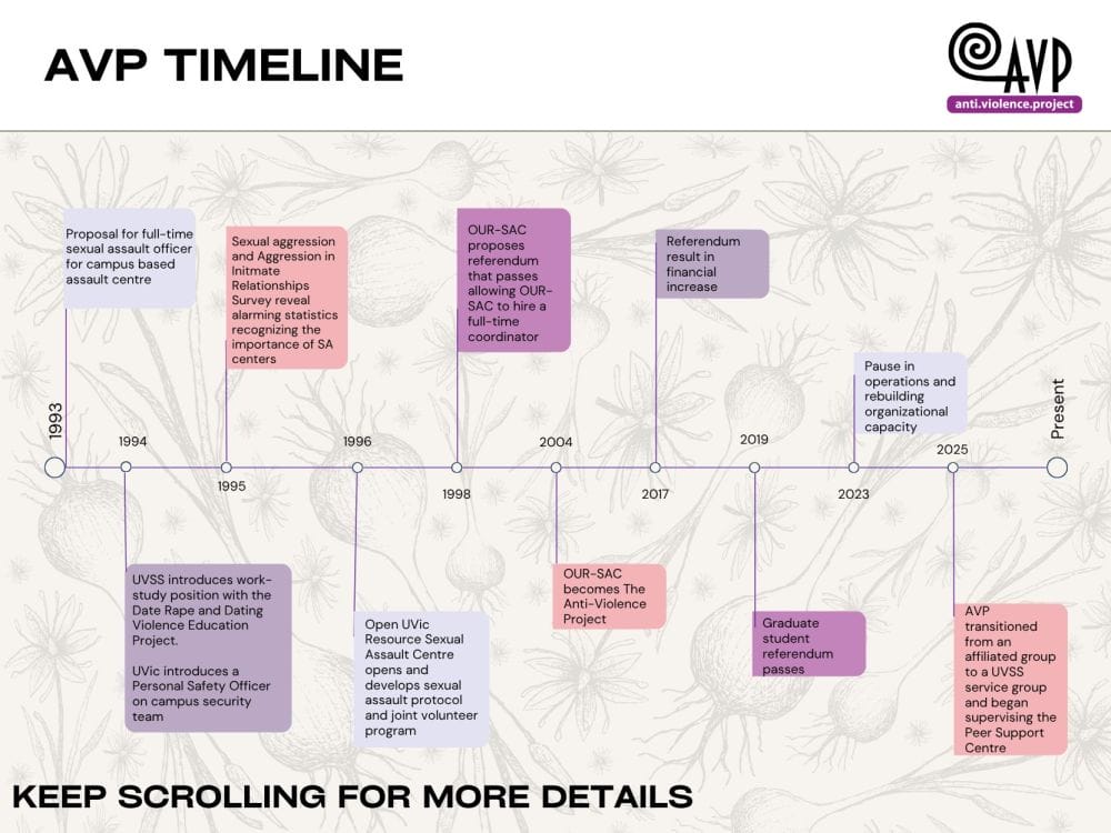 AVP transitioned from an affiliated group to a UVSS service group and began supervising the Peer Support Centre (PSC). The PSC operates within AVP to provide peer support for student concerns beyond the scope of sexualized and gender-based violence. ​