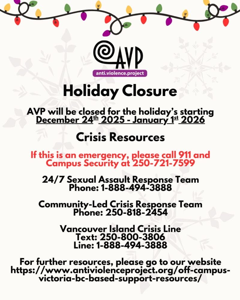AVP will be closed for the holidays from December 24th – January 1st returning on January 2nd 2026. If you are in need of immediate help please see the resources below.