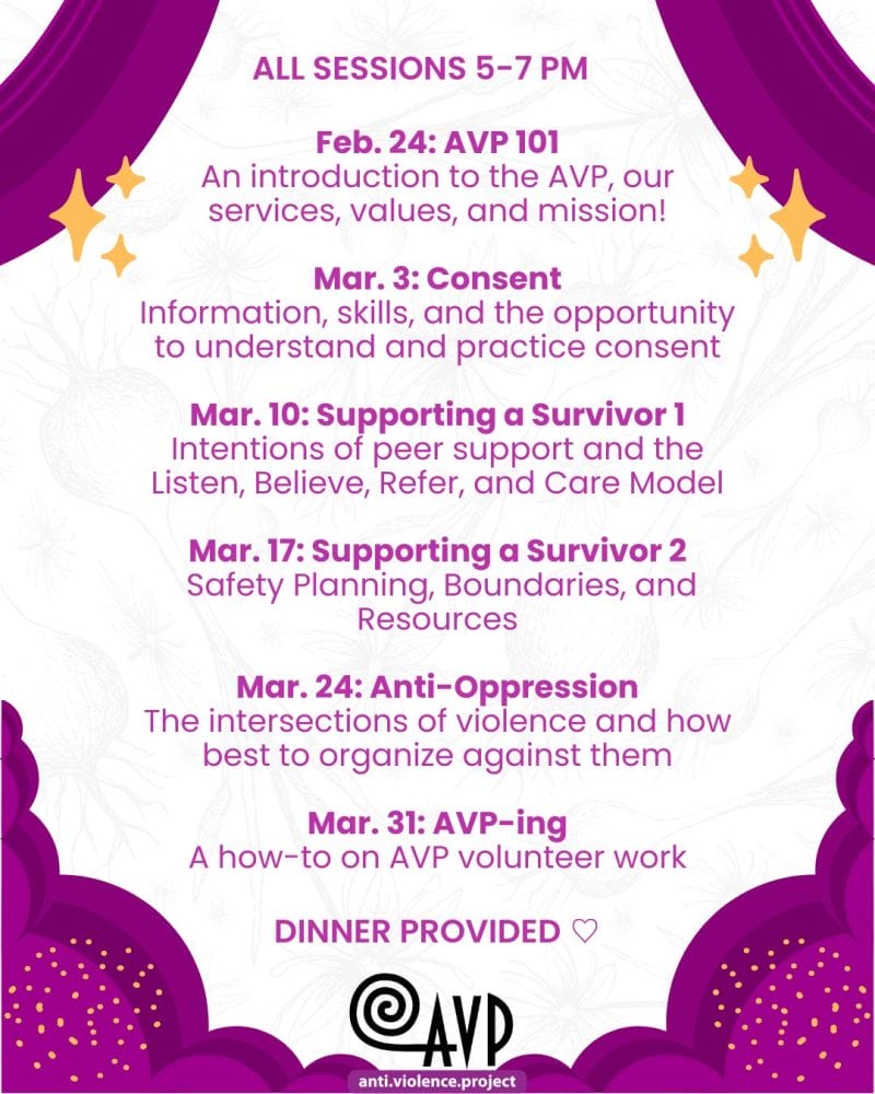 👥Covering topics such as AVP 101, Supporting a Survivor, Consent, Anti-Oppression, and “AVP-ing”
